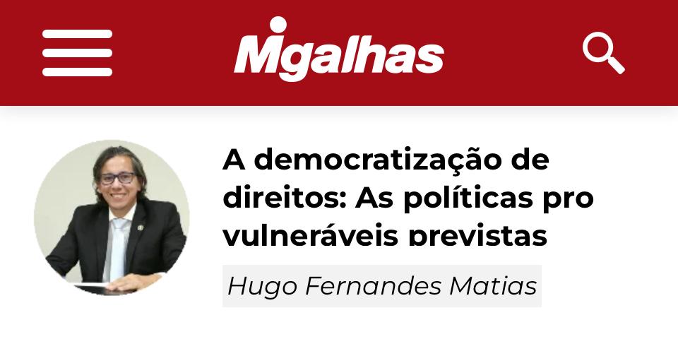 A atuação estratégica da Defensoria Pública na formulação de políticas públicas e na transformação do cenário legislativo brasileiro é o tema central do artigo intitulado "A democratização de direitos: As políticas pro vulneráveis previstas em inovações legislativas derivadas da atuação da Defensoria", assinado pelo defensor público do Espírito Santo Hugo Fernandes Matias.