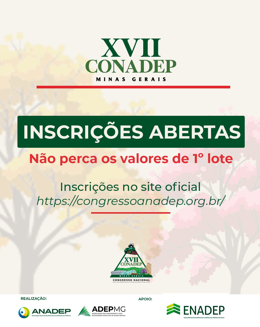Já estão abertas as inscrições para o XVII Congresso Nacional das Defensoras e Defensores Públicos. O evento será uma realização da Associação Nacional das Defensoras e Defensores Públicos (ANADEP), em parceria com a Associação das Defensoras e Defensores Públicos de Minas Gerais (ADEP-MG), de 17 a 20 de novembro, em Belo Horizonte (MG).