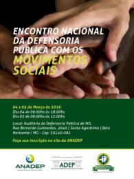 A organização dos movimentos sociais tem crescido exponencialmente no Brasil. As minorias têm ido às ruas para lutar pelos seus direitos. E é neste contexto de discussão desses direitos que a Associação Nacional dos Defensores Públicos (ANADEP), com apoio da Associação dos Defensores Públicos de Minas Gerais e da Defensoria Pública do Estado, promoverá o I Encontro Nacional da Defensoria Pública com os Movimentos Sociais. Serão dois dias de debates entre lideranças dos movimentos sociais, a sociedade civil organizada e representantes da Defensoria Pública nacional. O evento vai acontecer nos dias 4 e 5 de março de 2016, no auditório da Defensoria Pública de Minas Gerais, localizada na rua Bernardo Guimarães, nº 2.640 - bairro Santo Agostinho, Belo Horizonte – MG.