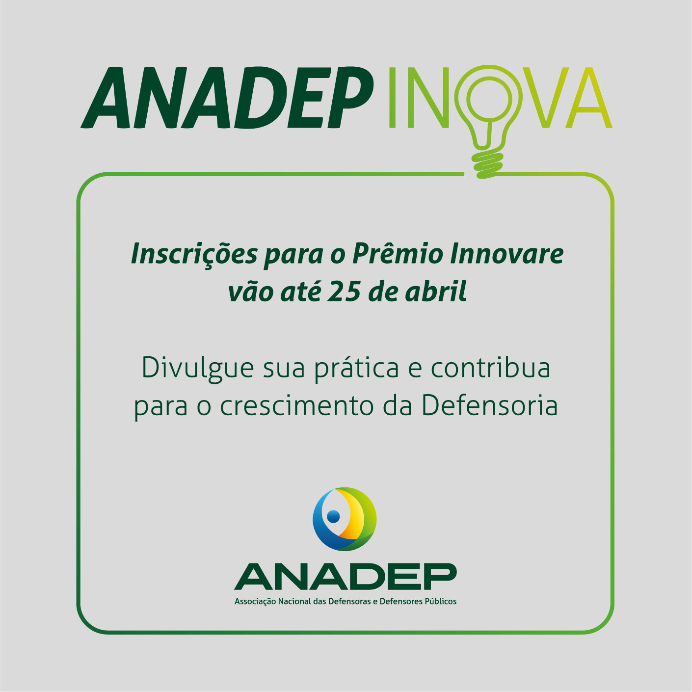 Para incentivar a participação das defensoras e defensores públicos no Prêmio Innovare, a Associação Nacional lança, nesta quarta-feira (3/4), o projeto "ANADEP INOVA". A iniciativa visa a reconhecer e disseminar práticas exitosas da categoria para todas as Defensorias Públicas Estaduais do país.