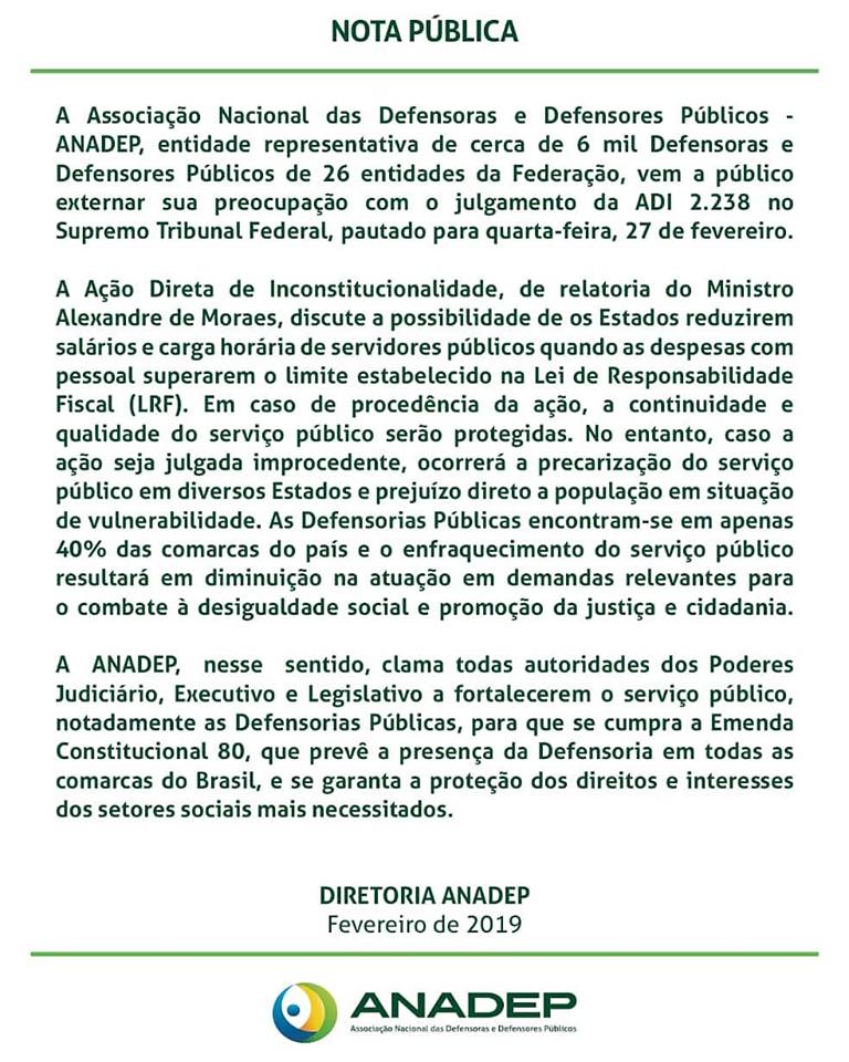 NOTA PÚBLICA: ANADEP manifesta-se sobre ADI 2238