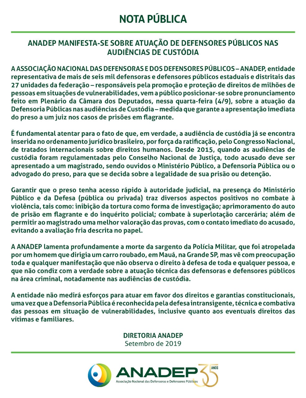 NOTA PÚBLICA: ANADEP manifesta-se sobre atuação de defensores públicos nas audiências de custódia