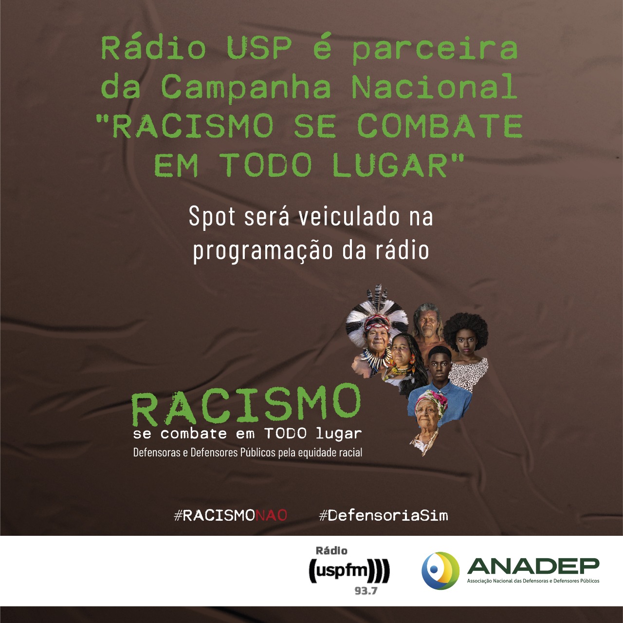 A Rádio USP será parceira na divulgação da campanha nacional "Racismo se combate em todo lugar: Defensoras e Defensores Públicos pela equidade racial". O spot da campanha será veiculado gratuitamente nos intervalos da programação da rádio, que é sintonizada em São Paulo na frequência FM 93,7 MHz e em todo o Brasil, através da internet. (https://jornal.usp.br/radio/).
