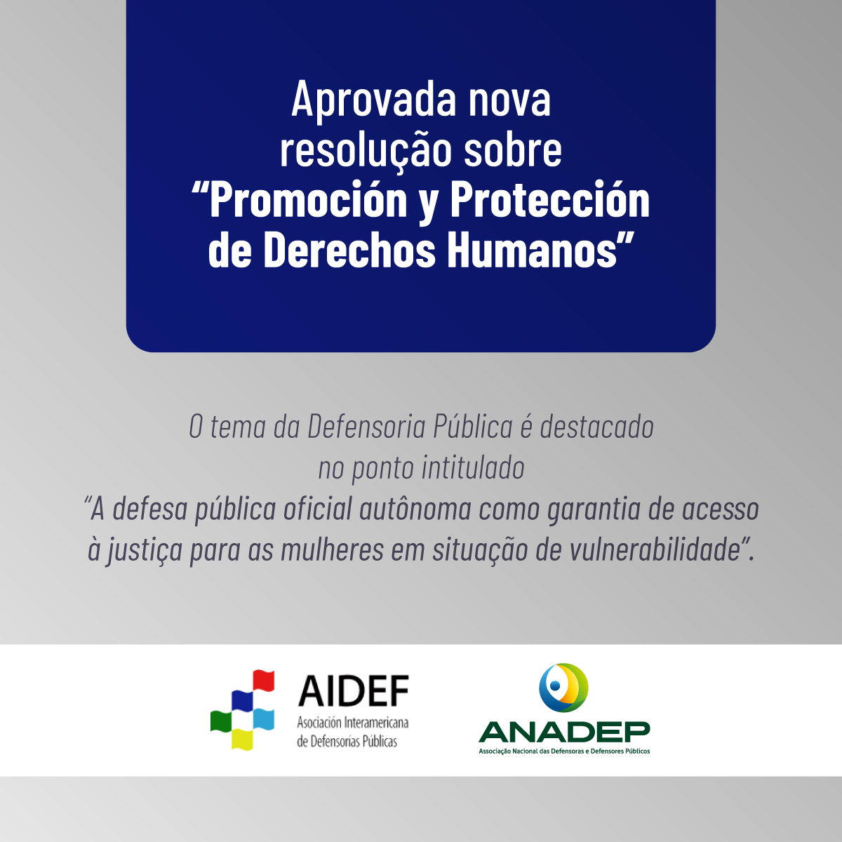 Na resolução, a OEA afirma "a importância fundamental do serviço de assistência jurídica gratuita prestado pelos Defensores Públicos Oficiais das Américas no âmbito de suas competências - para garantir o acesso à justiça para todas as pessoas e, em particular, para todas as mulheres e meninas vítimas de violência sexual por motivos de gênero”.