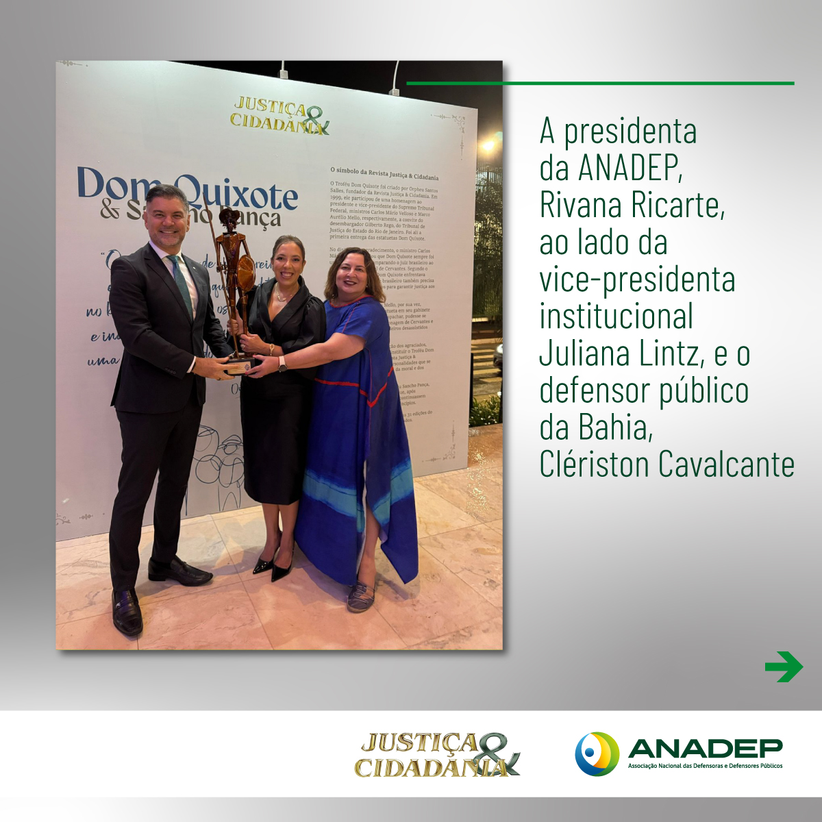 A presidenta da ANADEP, Rivana Ricarte, recebeu, na noite desta terça-feira (22/10), o Troféu "Sancho Pança", da Revista Justiça & Cidadania. A comenda é considerada um dos mais prestigiados reconhecimentos no cenário jurídico e social do Brasil. Esta é a 31ª edição do evento, que homenageia personalidades e instituições que se destacam na defesa e no fortalecimento da justiça, dos direitos humanos, da cidadania e da democracia.