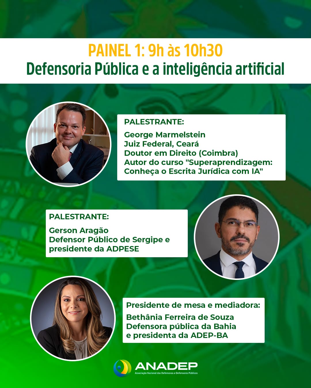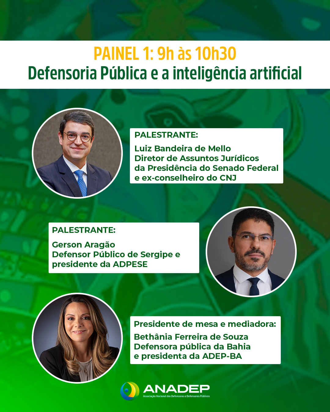 Na sexta-feira, 7 de novembro, as atividades terão início às 9h, com o painel “Defensoria Pública e Inteligência Artificial”, conduzido por Luiz Bandeira de Mello, diretor de Assuntos Jurídicos da Presidência do Senado Federal e ex-conselheiro do CNJ, e por Gerson Aragão, defensor público de Sergipe e presidente da ADPESE. A moderação ficará a cargo da defensora pública e presidenta da ADEP-BA, Bethânia Ferreira.
