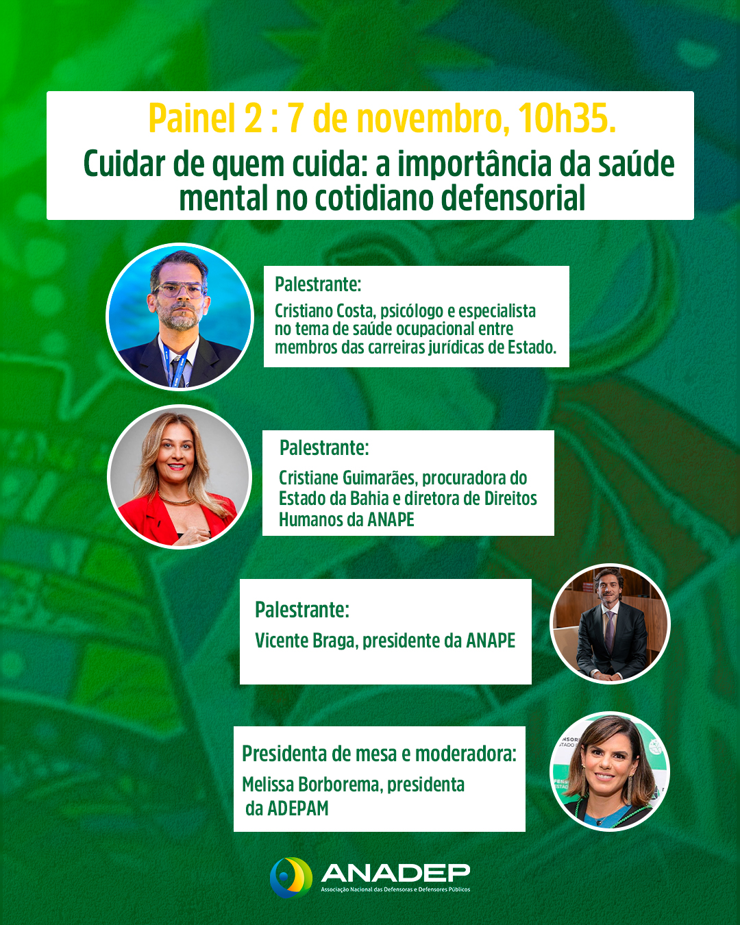 Ainda pela manhã, o segundo painel, “Cuidar de quem cuida: a importância da saúde mental no cotidiano defensorial”, trará para o debate o psicólogo organizacional Cristiano Costa; a procuradora do Estado da Bahia e diretora de Direitos Humanos da ANAPE, Cristiane Guimarães; e o presidente da ANAPE, Vicente Braga. A moderação será conduzida pela defensora pública e presidenta da ADEPAM, Melissa Borborema.