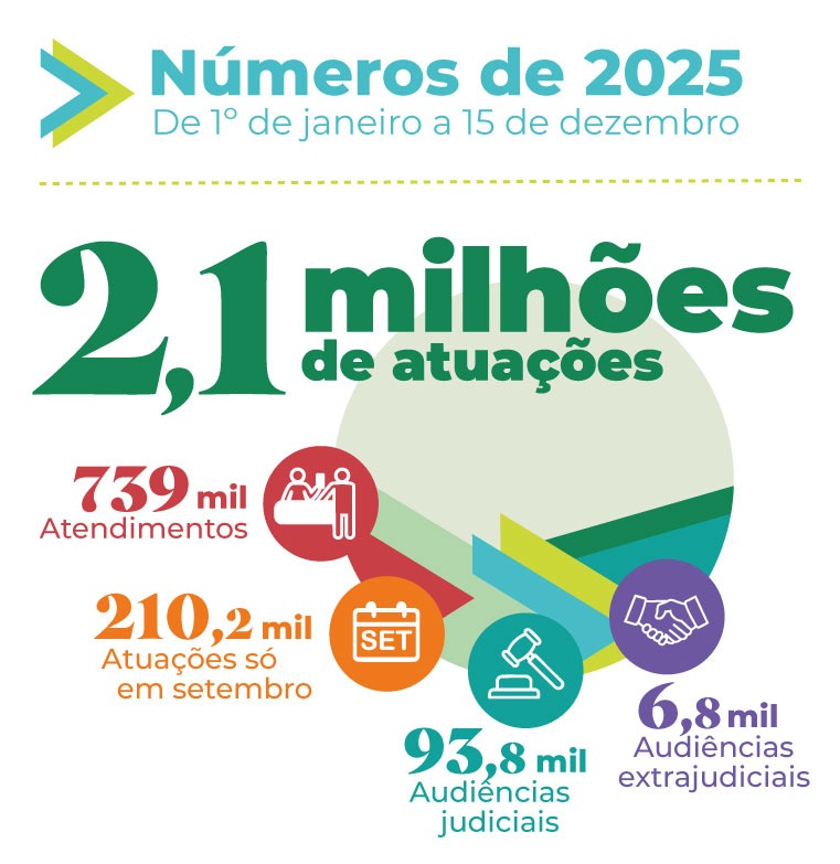Em relação a 2015, quando foram contabilizadas 572.222 atuações, o crescimento é de 271,8%. “Esse salto revela mais do que um aumento de demandas. Revela um investimento sistemático na melhoria de fluxos, na precisão de registros, nas atuações das nossas equipes e na condução dos processos internos, cada vez mais qualificados e com respostas mais ágeis à população”, avalia a defensora geral Sâmia Farias.