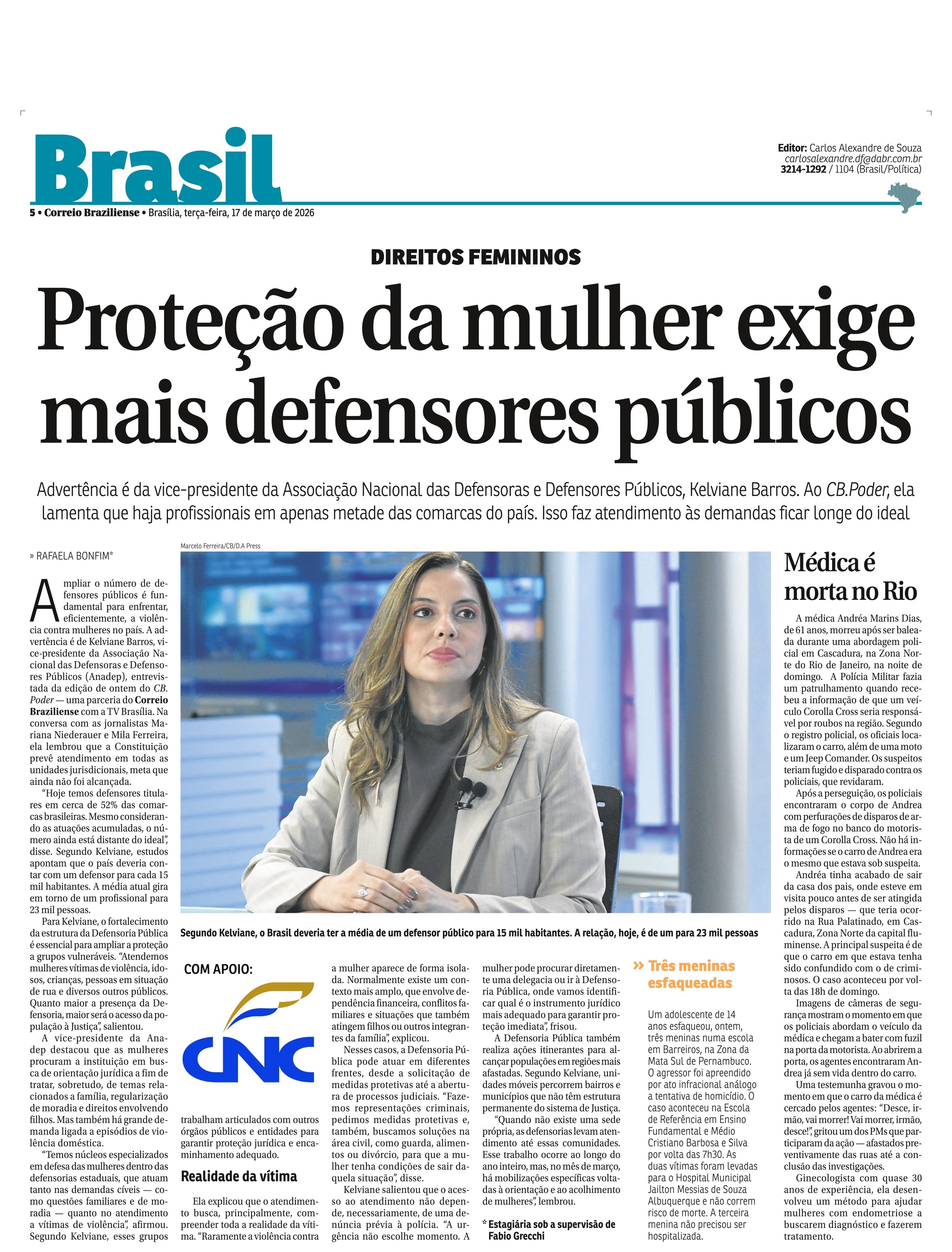 A vice-presidente da Associação Nacional dos Defensores Públicos (Anadep), Kelviane Barros, afirmou que a ampliação da rede de assistência jurídica e o fortalecimento da Defensoria Pública são fundamentais para enfrentar a violência de gênero no país. A declaração foi feita em entrevista ao CB.Poder — uma parceria do Correio Braziliense com a TV Brasília.