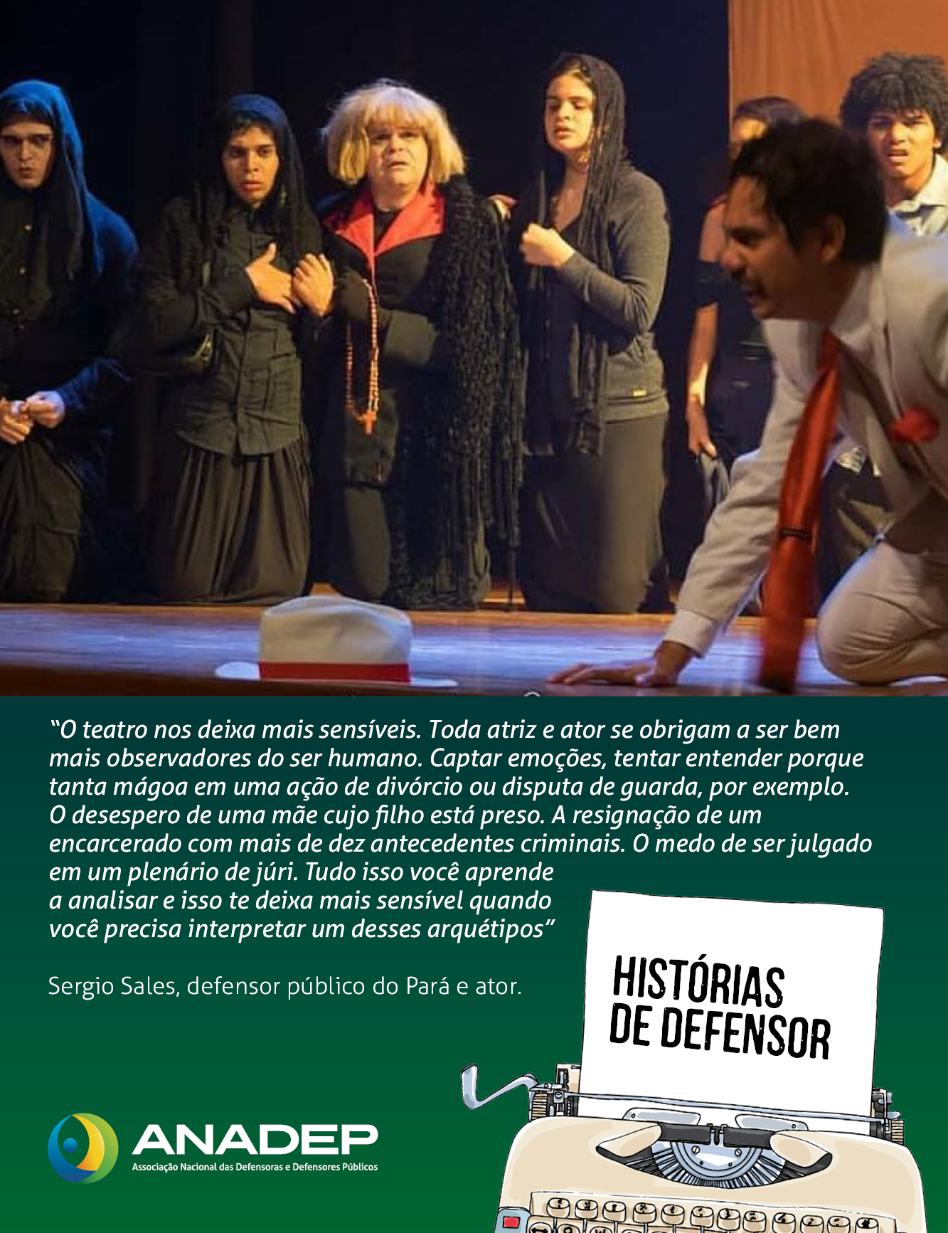 Fazer teatro é um movimento necessariamente político! Mudar a sociedade requer uma postura política firme, e isso a ANADEP faz com maestria. Fortalecer a Defensoria Pública é dar o protagonismo ao oprimido, como o teatrólogo Augusto Boal sempre sonhou. Sem o trabalho da ANADEP, defensoras e defensores públicos não conseguiriam ser os verdadeiros agentes de transformação social que nasceram para ser. Ficaríamos apenas observando, inertes, as tragédias e comédias que os outros dirigiriam em nossas vidas.