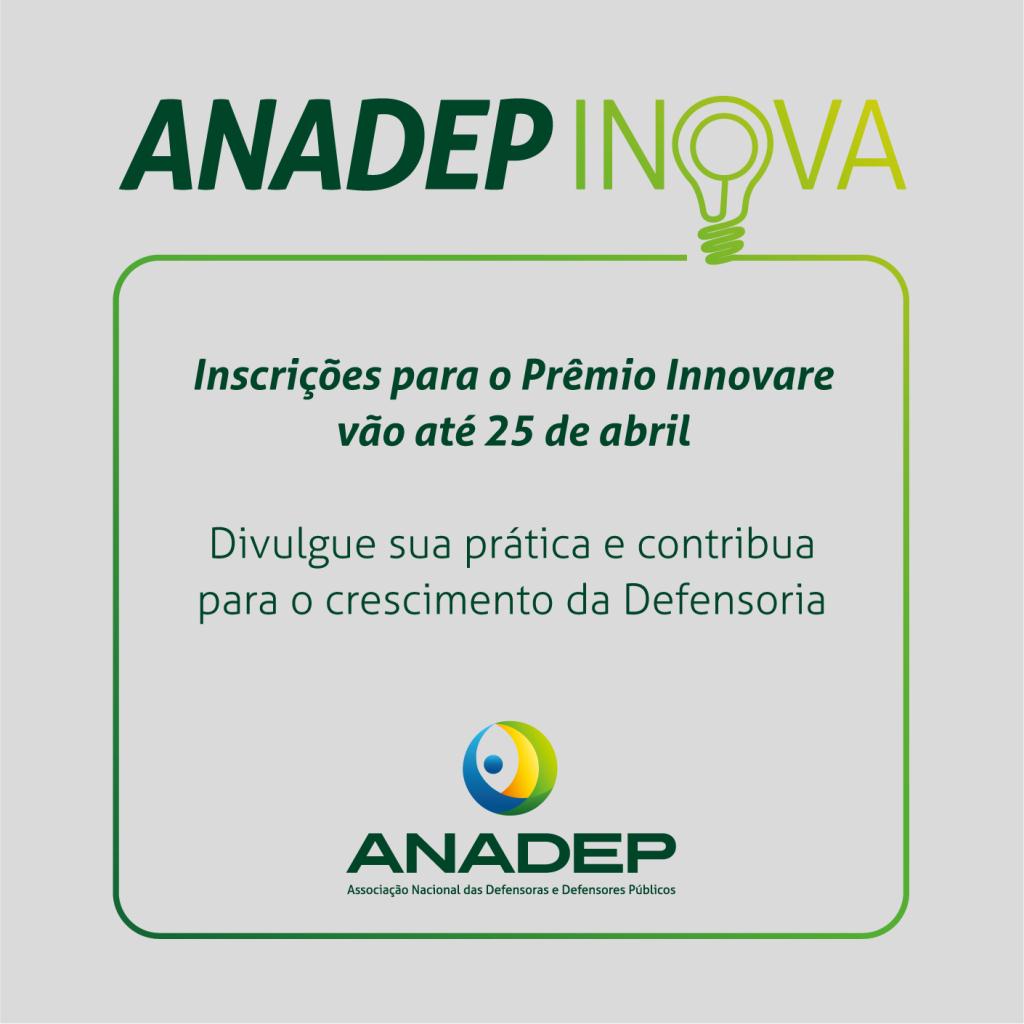 Para incentivar a participação das defensoras e defensores públicos no Prêmio Innovare, a Associação Nacional lançou o projeto "ANADEP INOVA". A iniciativa visa a reconhecer e disseminar práticas exitosas da categoria para todas as Defensorias Públicas Estaduais do país. Além disso, as práticas que forem finalistas no Prêmio Innovare, a partir deste ano, terão premiação paralela da ANADEP. Clique aqui e saiba mais.