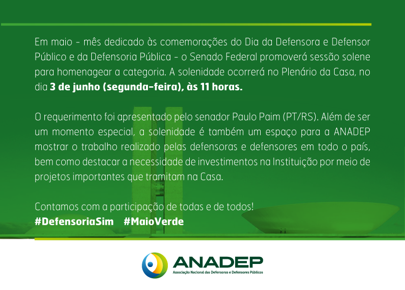 No dia 3 de junho (segunda-feira), a partir das 11 horas, o plenário do Senado Federal terá uma sessão solene para marcar a passagem do Dia da Defensora, do Defensor Público e da Defensoria Pública – tradicionalmente celebrado no dia 19 de maio. A solenidade comemorará também o aniversário da Emenda Constitucional 80/2014, que completará cinco anos. O requerimento da sessão foi apresentado pelo senador Paulo Paim (PT/RS).