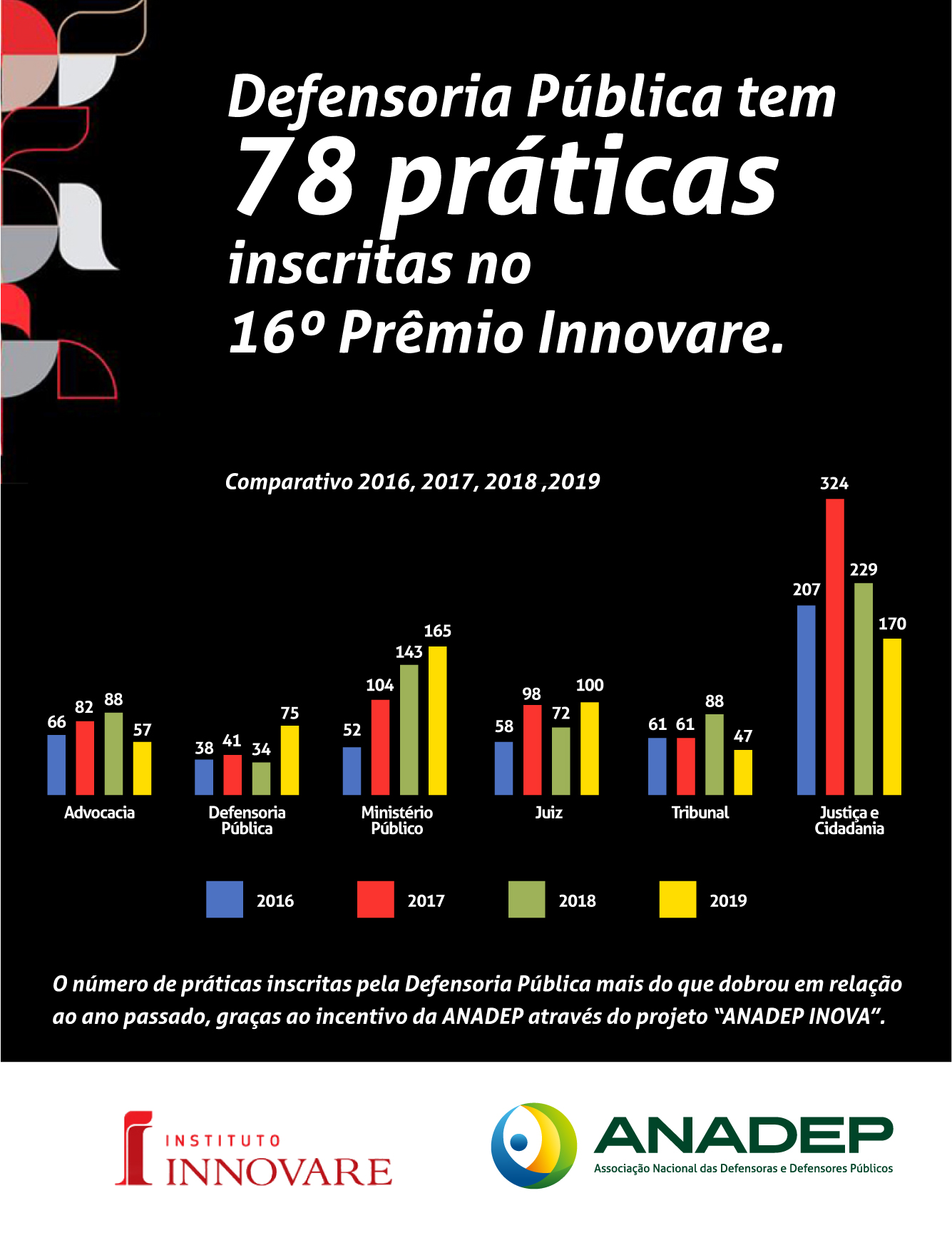 A 16ª edição do Prêmio Innovare tem 617 práticas na disputa, este ano. Do total, a Defensoria Pública inscreveu 78 práticas, mais que o dobro do ano passado, graças ao comprometimento das defensoras e defensores com novas práticas, bem como o incentivo da ANADEP através do projeto "ANADEP INOVA".