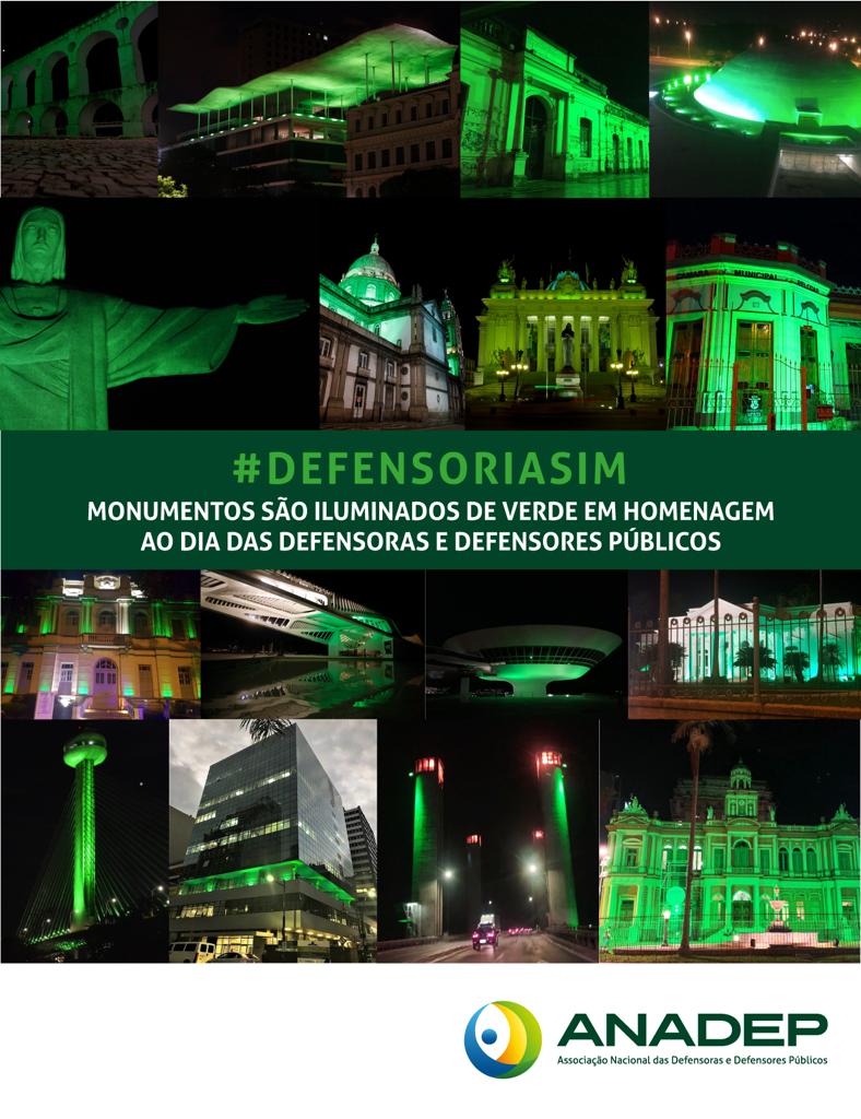 A ANADEP, em parceria com as Associações Estaduais e Defensorias dos Estados, deixou vários pontos turísticos e principais monumentos das cidades iluminados de verde. O chamado MAIO VERDE é uma das ações da Campanha Nacional 2019 e visa a lembrar o Dia Nacional da Defensoria Pública, da defensora e do defensor público, comemorado no dia 19 de maio.