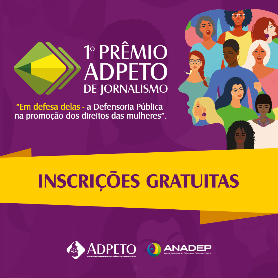 A Associação das Defensoras e Defensores Públicos do Estado do Tocantins realizará o 1° Prêmio ADPETO de Jornalismo no Estado. As inscrições poderão ser realizadas entre os dias 21 de maio a 20 de setembro de 2019, por e-mail, inscrição presencial e via Correios. Clique aqui e saiba mais.