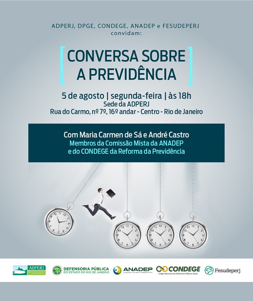 Com o objetivo de tirar dúvidas de defensoras e defensores públicos sobre a reforma da Previdência, a Associação dos Defensores Públicos do Rio de Janeiro (ADPERJ), Associação Nacional das Defensoras e Defensores Públicos (ANADEP), a Defensoria Pública do Estado do Rio de Janeiro, o Colégio Nacional de Defensores Públicos-Gerais (CONDEGE) e a Fundação Escola Superior da Defensoria Pública do Estado do Rio de Janeiro (FESUDEPERJ) promoverão, na próxima segunda-feira (05/08), às 18h, uma roda de conversa sobre o tema. O evento acontecerá na sede da ADPERJ.