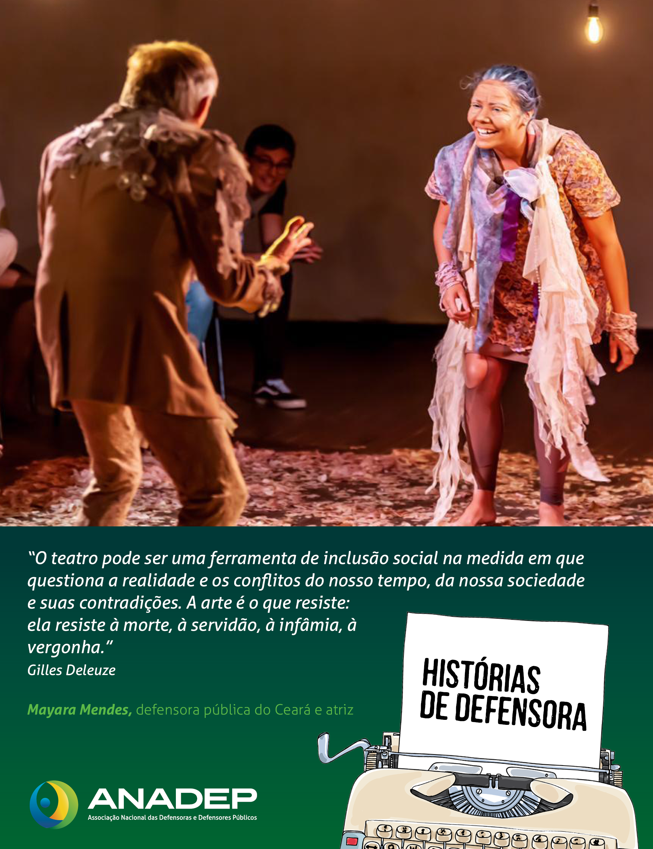 Defensora pública no Ceará há mais de três anos, Mayara Mendes coleciona duas paixões, a Defensoria Pública e o teatro, com algo em comum: prestar ao povo. No currículo, a atriz e defensora já coleciona algumas montagens, como a peça “Abajur Lilás” texto de Plínio Salgado, direção de Gyl Giffony, na mostra “Pequenos trabalhos não são trabalhos Pequenos, “O Avarento”, texto de Moliere, direção de Henrique Gonzaga e “Tempo de Retirada”, texto de Eliana Coelho, Ernane Pereira e Rafael Barbosa, direção de Luis Carlos Shinoda. Todas as peças apresentadas nos teatros da cidade de Fortaleza.