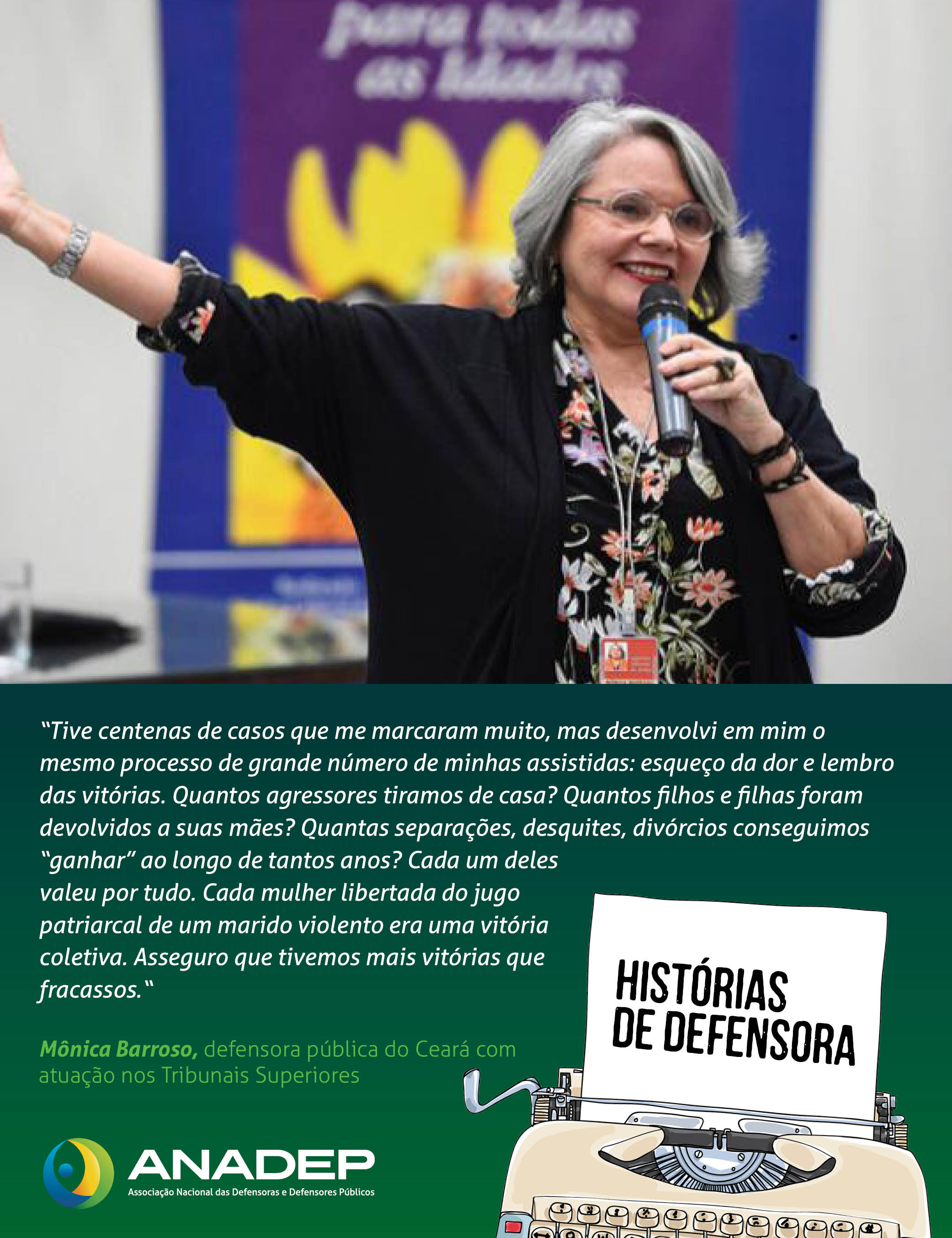 Em um mês alusivo ao Dia Internacional da Mulher, o Histórias de Defensora desta semana conta a trajetória da defensora pública do Ceará, Mônica Barroso, que atua fortemente nos Tribunais Superiores e foi protagonista na implantação do primeiro núcleo temático da Defensoria em defesa das mulheres vítimas de violência. Além disso, a defensora é professora universitária licenciada de Direitos Humanos e atuou na construção da Lei Maria da Penha - sancionada em 7 de agosto de 2006, como Lei n.º 11.340 que visa proteger a mulher da violência doméstica e familiar. Na entrevista, a defensora conta os caminhos percorridos até agora como defensora pública. Confira na íntegra: